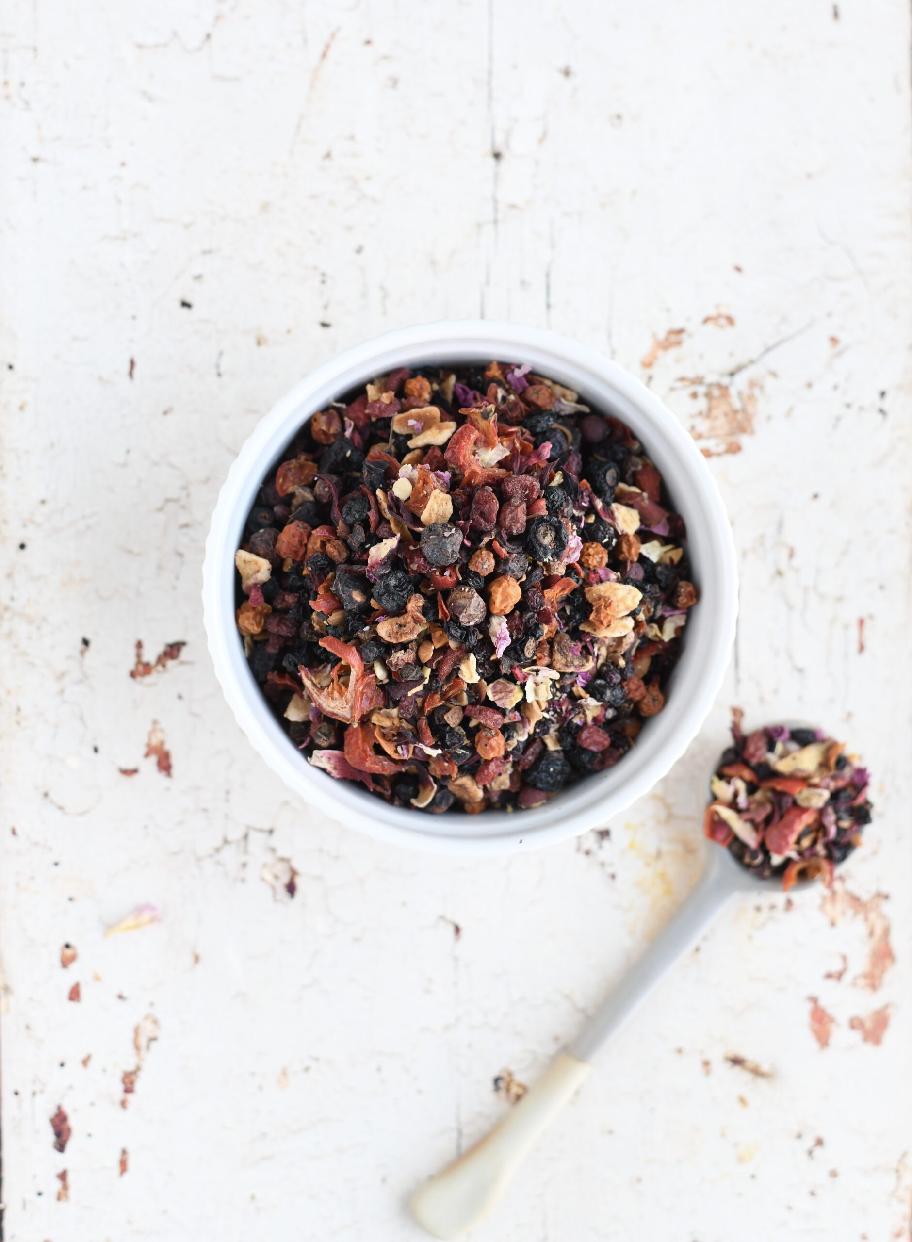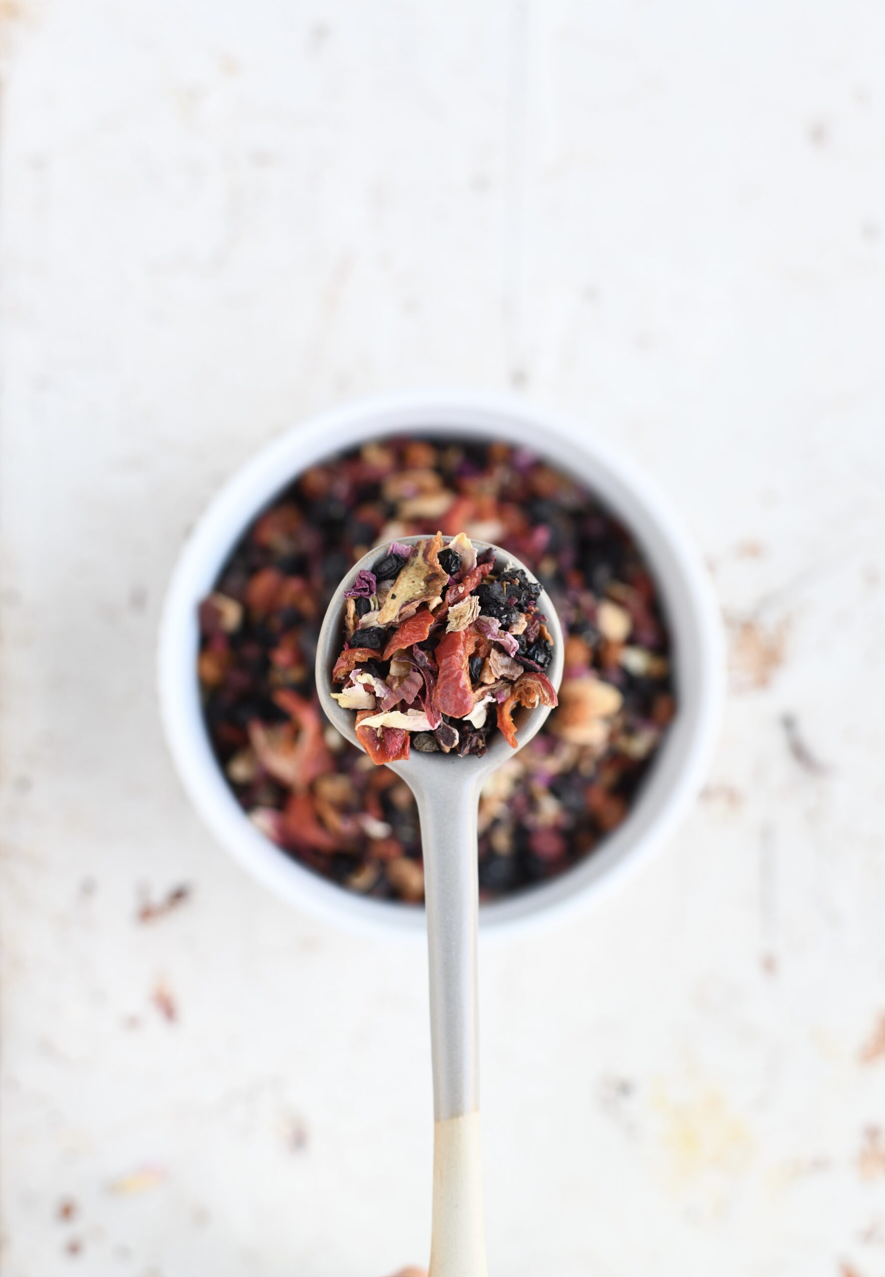 Składniki: róża owoc* 22%, jabłko owoc*, tarnina owoc*, borówka wysoka owoc*, berberys owoc*, bez czarny owoc*, jarzębina owoc*, porzeczka czarna owoc*, głóg owoc*, hibiskus kwiat*, malina owoc*, róża płatki*.