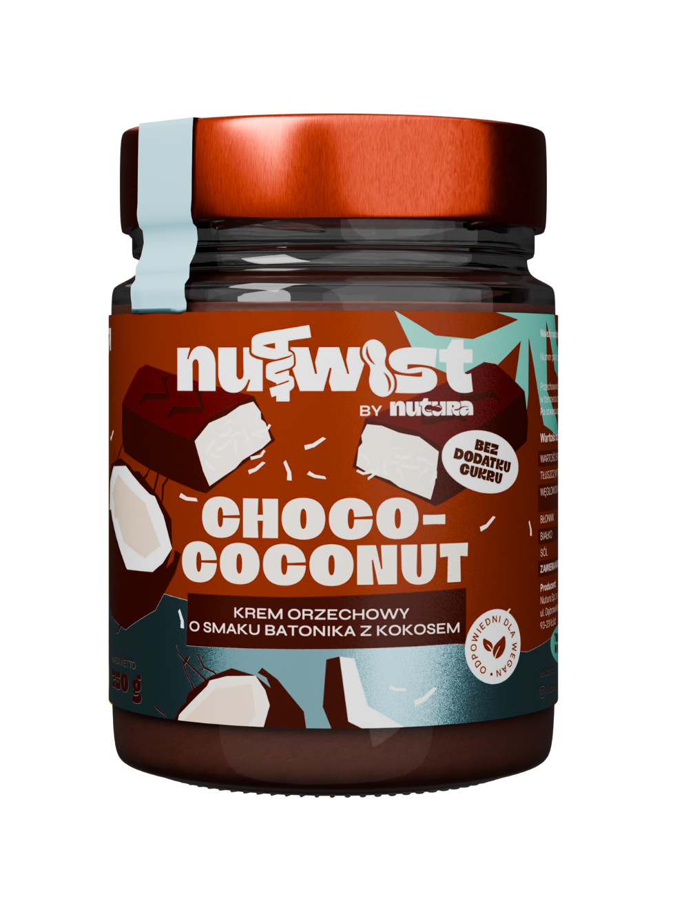 Nutwist Choco-Coconut Flavour to połączenie aksamitnej pasty orzechowej z intensywnym smakiem czekolady i naturalną nutą kokosa. Idealna do smarowania pieczywa, naleśników, gofrów czy jako składnik deserów i owsianek. Ma gładką konsystencję i przyjemnie słodki smak – bez oleju palmowego i zbędnych dodatków.