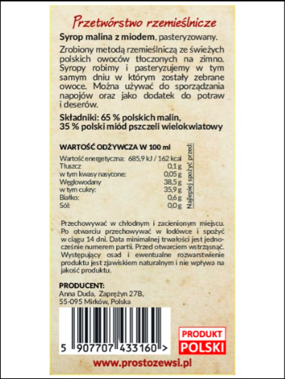 Skład: 65% polskich malin, 35% polskiego miodu wielokwiatowego.