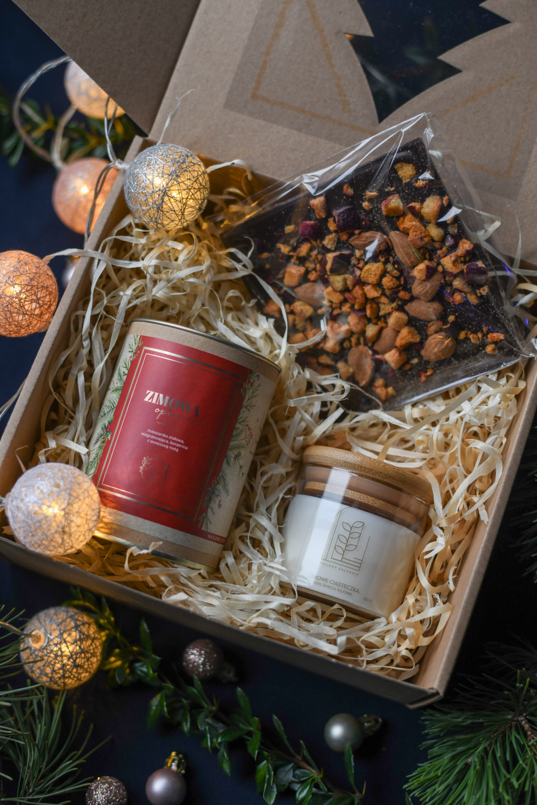 Ten zestaw to kwintesencja świątecznego ciepła zamknięta w pięknym pudełku. Znajdziesz w nim rozgrzewającą herbatę zimową, świąteczną świecę sojową o otulającym zapachu oraz czekoladową choinkę bez cukru – słodką, ale w zdrowym wydaniu.